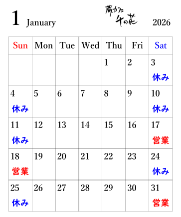 2025年12月31日 ニュース 2026年1月のランチ営業日は、17日(土)、18日(日)、31日(土)となります。 ご来店お待ちしております。 tweet 蔵カフェ『千の花』1月17日(土)、18日(日)ランチ営業のお知らせ »