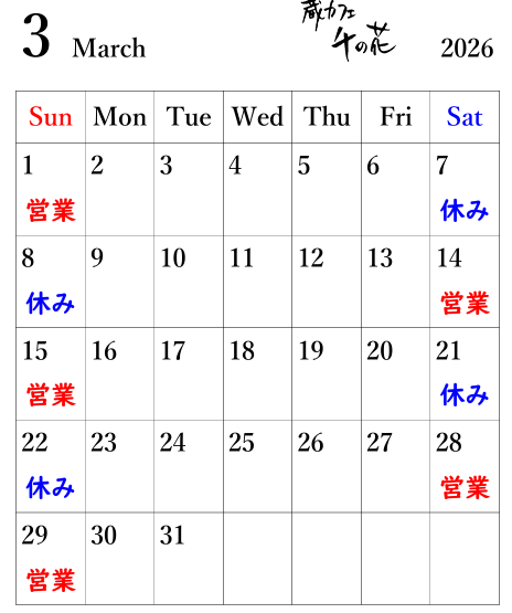 蔵カフェ『千の花』3月のランチ営業日のお知らせ
